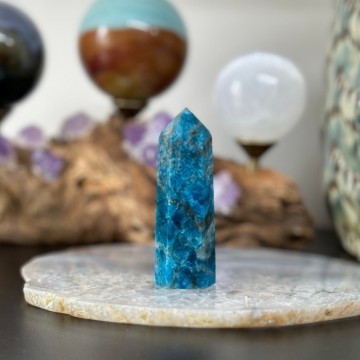 Blå Aragonitt er en beroligende stein som minner om stillheten i havet. Den lindrer stress, styrker kommunikasjon og bringer fred, klarhet og egenkjærlighet. Dette tårnet er 109g og 8,5cm høyt.