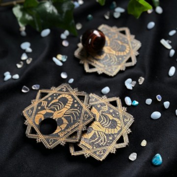 Stjernetegn krystallholder i tre, ca. 7 cm bred. Perfekt for krystallkuler på 2-3 cm. En magisk base for astrologiske ritualer, alterarbeid eller dekorasjon. Designet og produsert med kjærlighet av Vel Unt.