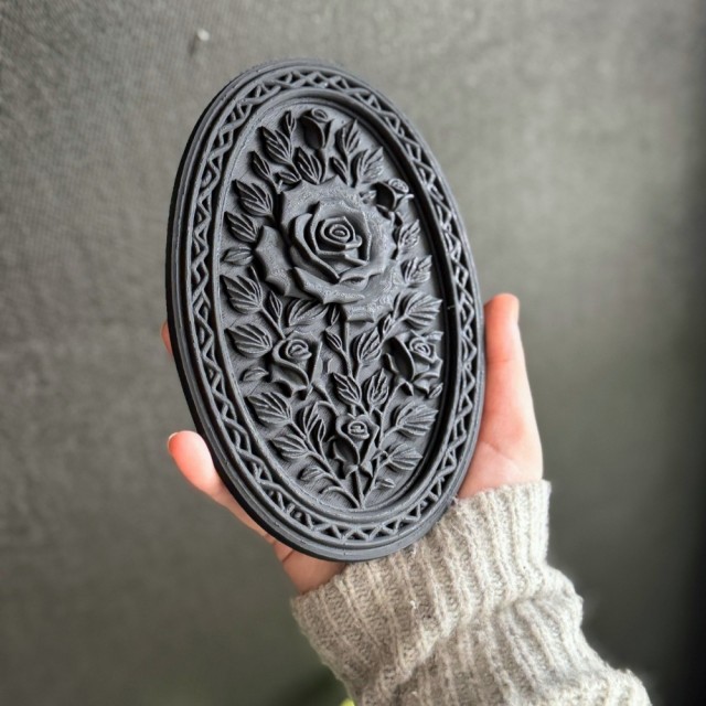 Den detaljerte rosen trer frem fra bakgrunnen omgitt av blader og ornamentert kant, som en klassisk cameo hentet fra en gammel herskapsbolig. Den matte sorte finishen gir et sofistikert og dramatisk uttrykk uten å bli overveldende.