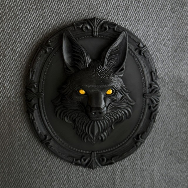 Reven trer frem fra en ornamentert, gotisk ramme med et uttrykk som føles både gammelt og magisk. De glødende gyldne øynene gir liv til figuren og skaper en nesten levende tilstedeværelse i rommet.