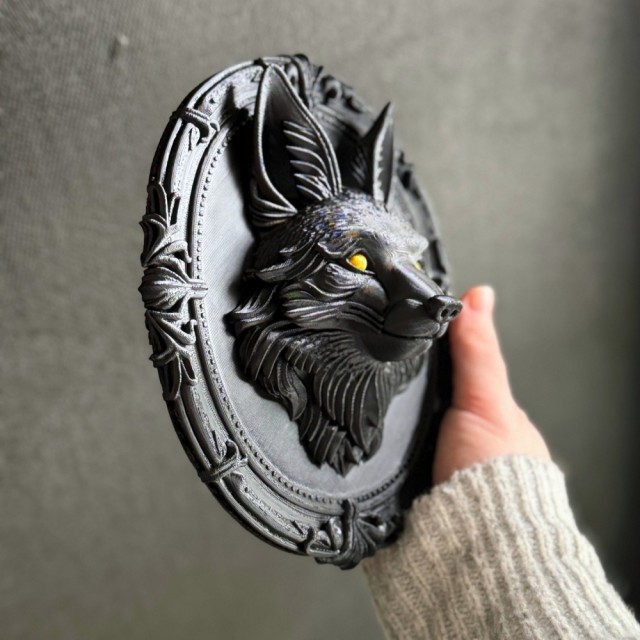 Detaljene i pelsen og rammen gir en dramatisk og eksklusiv følelse - som et relikvie fra en mørk eventyrskog. Dette er ikke masseprodusert veggpynt du finner overalt. Dette er et unikt Vel Unt-produkt, 3D-printet av oss på vestkysten i Norge.