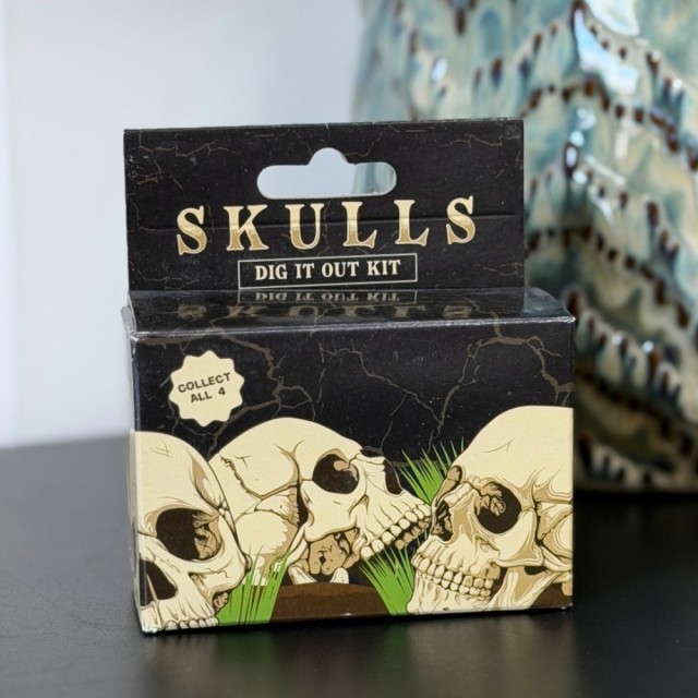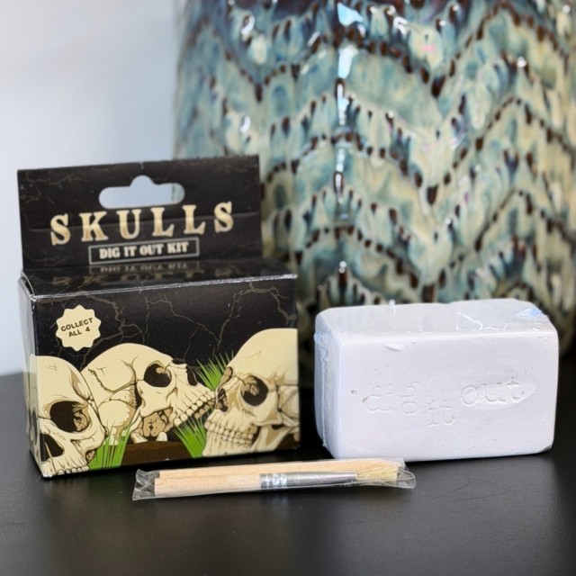 Dette mini “dig it out” settet lar deg grave frem din egen lille hodeskalle, akkurat som en ekte arkeolog. Inni blokken skjuler det seg en overraskelse som sakte kommer frem jo mer du jobber med den.