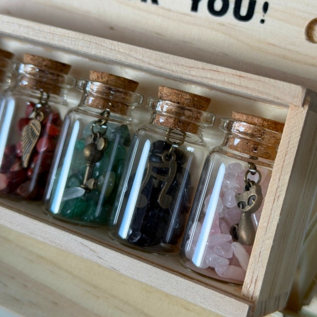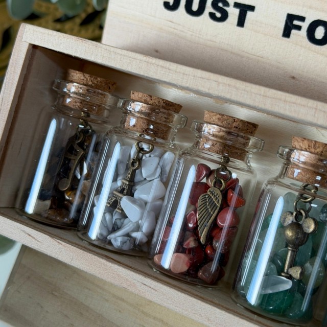 Denne nydelige treboksen inneholder 6 små glassflasker med kork, hver fylt med ekte krystallchips og en tilfeldig utvalgt charm. På lokket står teksten “Just For You!” og det er akkurat slik den føles.