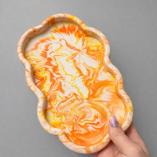 Dette skyformede fatet er for deg som vil ha noe litt mer levende, varmt og unikt i hjemmet ditt. De myke bølgende formene kombinert med marmorerte toner av oransje, gul og beige skaper et uttrykk som både er rolig og fullt av personlighet.