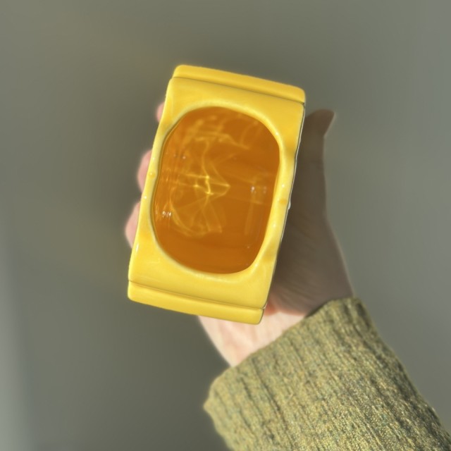 Denne er kjærlig designet i samarbeid med Raspberry Blossom. Dristighet og glede er hva dette fargerike merket handler om. Laget av keramikk med en glasert finish og med fargene gul, lilla og grønn, er denne vasen en fantastisk visuell skatt.