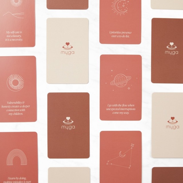 Et vakkert sett med 60 affirmasjonskort laget spesielt for mødre – fra de første dagene med babyduft og kaos, til de rolige stundene med refleksjon og egenkjærlighet.