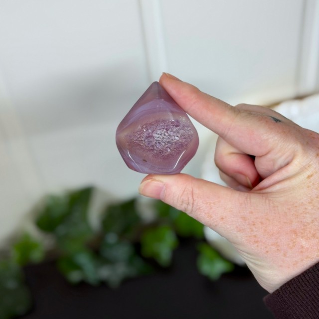 Nydelig lilla farget agat med drusy i seg. Denne er farget/dyed rosa. Størrelse: 4,8cm.