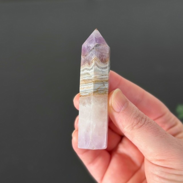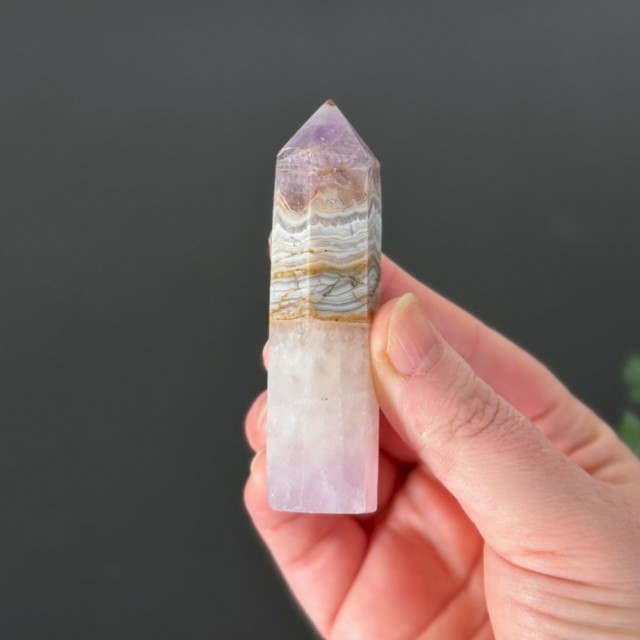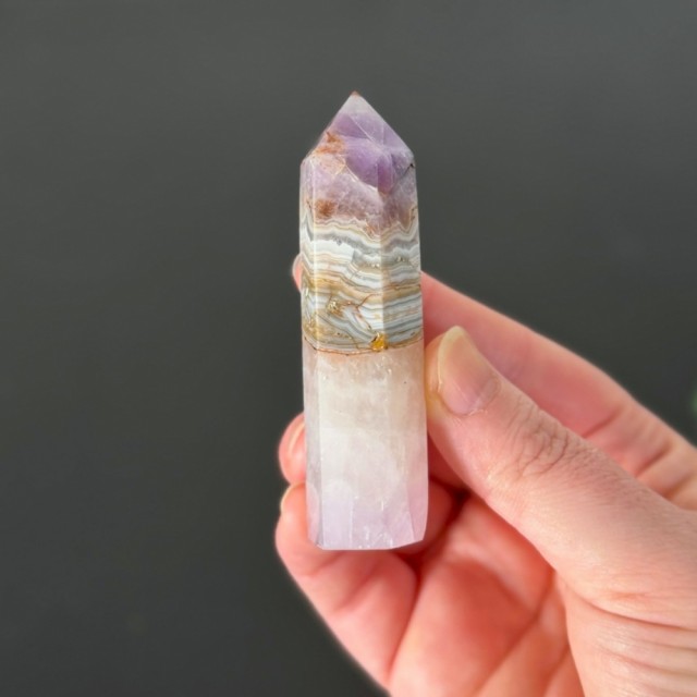 Ametyst med Meksikansk Blondeagat er en krystall for både sinn og sjel - en perfekt forening av ametystens rolige, spirituelle energi og agatens livlige jordkraft. Der ametyst åpner for intuisjon, indre ro og visdom, tilfører blondeagaten glede, stabilitet og en varmende energi som løfter humøret.