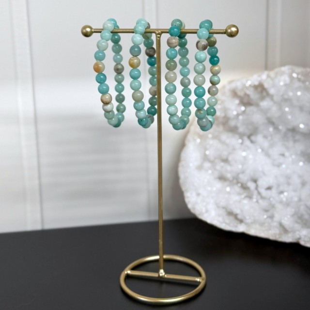 Amasonitt krystall armbånd med 8mm perler, passer ca 16-17cm håndledd. En myk blågrønn stein som forbindes med ro, kommunikasjon og indre balanse - perfekt alene eller kombinert i en personlig krystall stack.