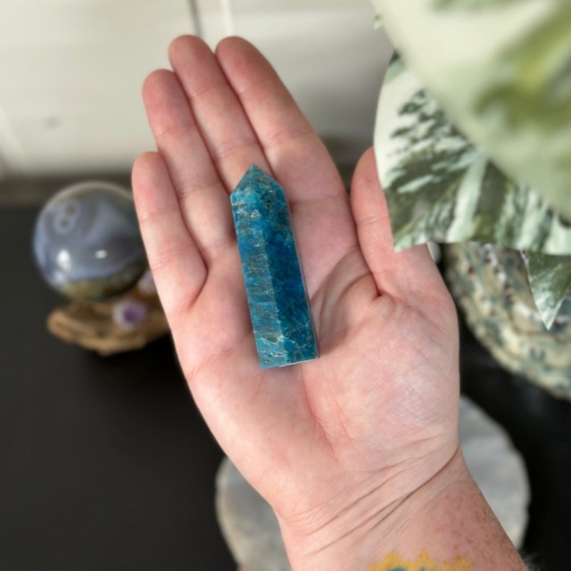 Nydelig Blå Apatitt tårn. Dette er 7cm høyt og veier ca 64g. Det er den krystallen du ser på bildene du får hvis du bestiller denne. Naturlige merker og små druser forekommer.