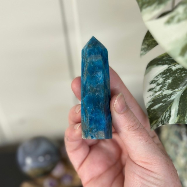 Nydelig Blå Apatitt tårn. Dette er 8,1cm høyt og veier ca 85g. Det er den krystallen du ser på bildene du får hvis du bestiller denne. OBS: Står litt skeivt men vises bare i noen retninger.