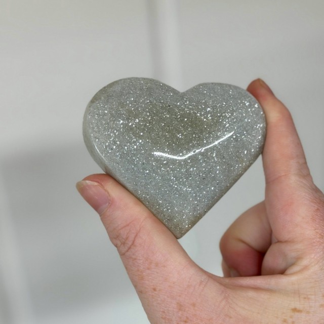 Sage Aventurin er en rolig og jordende stein med myke grønngrå toner og subtile mica-glimt. Dette hjerteformede stykket symboliserer indre balanse, trygghet og stille vekst – en vakker påminnelse om å lande i deg selv og puste dypere. 6x7x2,3cm/ 130g.
