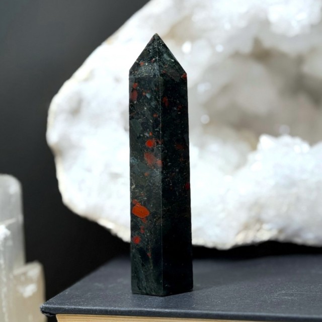 Som jordens egen puls bærer Afrikansk Blodstein rå styrke og ro. En stein for mot, balanse og indre kraft. Perfekt når du trenger å finne tilbake til deg selv. Dette tårnet er 7,6cm og veier 50g. Denne har Pyritt i seg.