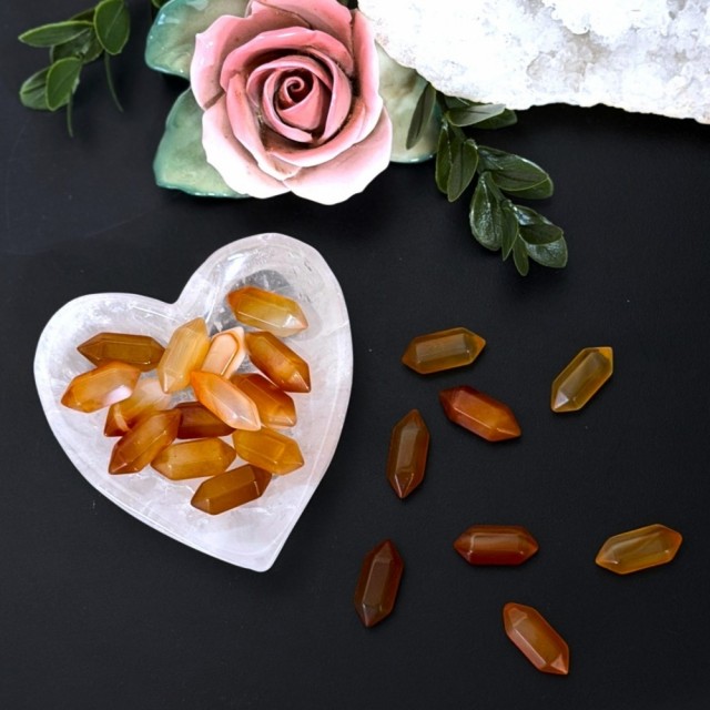 Oransje Karneol har lenge vært knyttet til fruktbarhet og kjærlighet, og brukes ofte som en stein for lidenskap og intime relasjoner. Den gir styrke til å overvinne seksuell angst, styrker bånd i forhold og minner deg om gleden ved å leve i nuet.