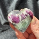 Silke Regnbue Fluoritt faceted hjerte. Dette er 6,4x5,1x1,1cm og veier ca 76g. Krystallholder kan kjøpes separert.