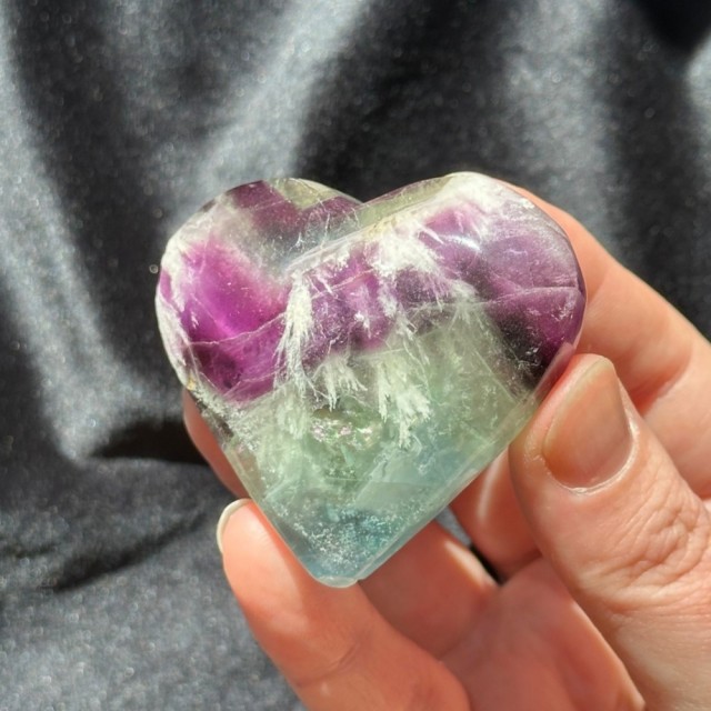 Feather Fluoritt hjerte. Dette er 4,6x5,3x1,9cm og veier ca 81g. Små naturlige merker forekommer.