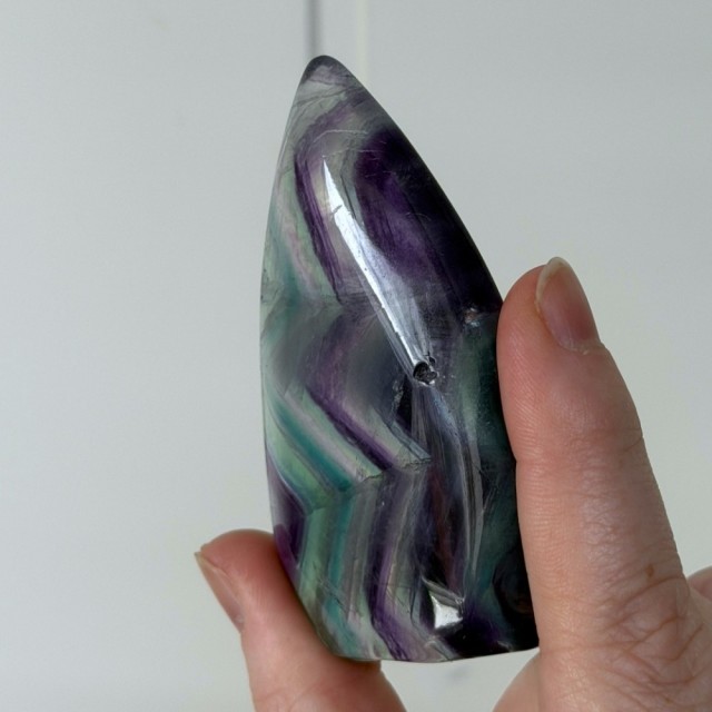 Nydelig Regnbue Fluoritt dråpe. Denne er 116,4g og har målene 8x5,1x1,5cm. Bildene er tatt i dagslys + sollys både inne og ute for å vise frem fargene. OBS: Denne har litt merker/groper i seg.