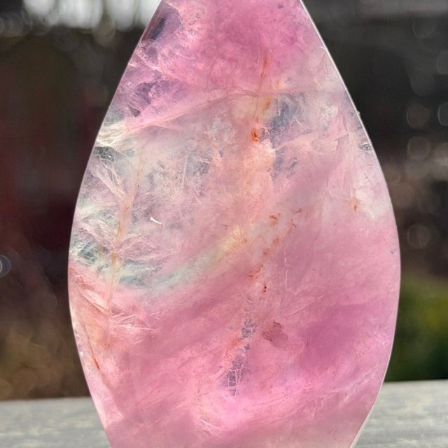Rosa Fluoritt er en sjelden og rolig krystall som støtter hjertet med myk styrke. Den fremmer balanse, selvaksept og indre ro – perfekt for deg som trenger litt ekstra omsorg i hverdagen. Denne er 8,8x5x1,8cm & 140g. Bilder tatt i sollys + litt merker.