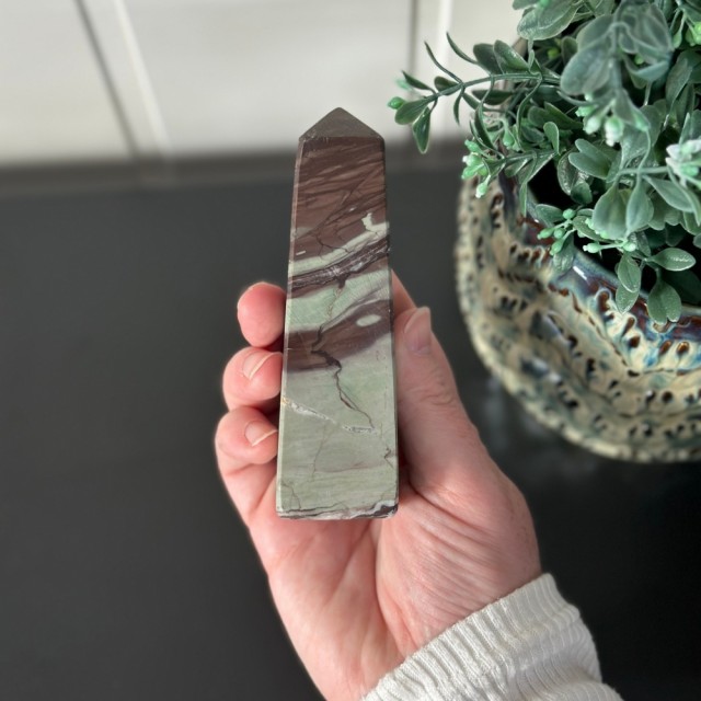 Candy Jaspis, en grønn og brun Jaspis fra Pakistan. Det hvite på krystallen er kvarts inneslutninger. Dette tårnet er 11,8cm høyt og veier ca 288g.