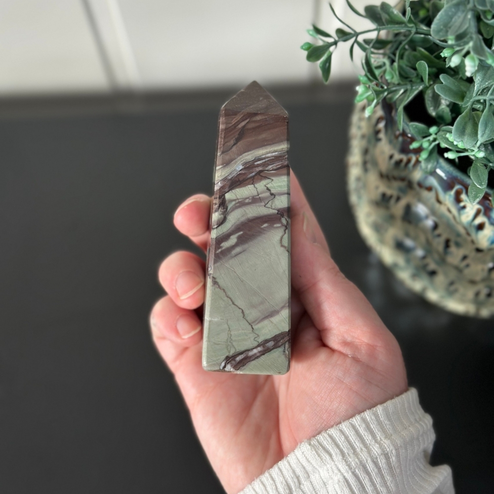 Candy Jaspis, en grønn og brun Jaspis fra Pakistan. Det hvite på krystallen er kvarts inneslutninger. Dette tårnet er 12cm høyt og veier ca 260g. OBS: miniatyr liten skade på toppen - kjøpt sånn.