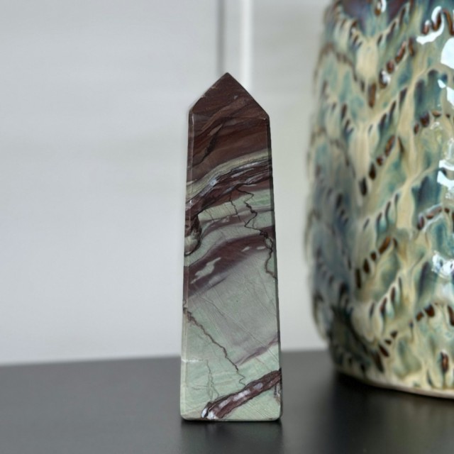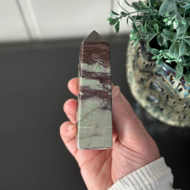 Candy Jaspis, en grønn og brun Jaspis fra Pakistan. Det hvite på krystallen er kvarts inneslutninger. Dette tårnet er 11,8cm høyt og veier ca 288g.