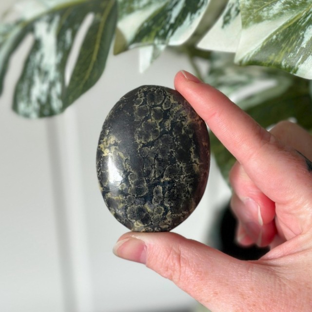 Kambaba Jaspis eller Snake Skin steinen dateres tilbake til tre milliarder år siden, og er et Stromatolittfossil av fossiliserte alger. Denne håndsteinen er 6,2x4,8x2,2cm og veier ca 112g.