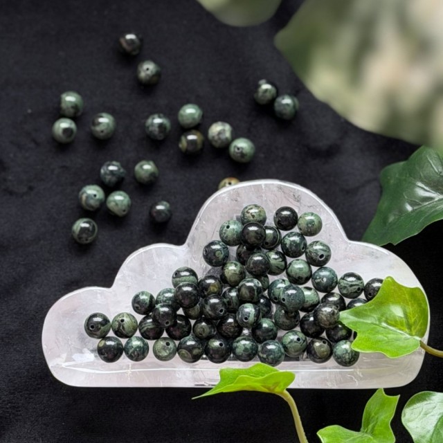 Dype 8mm Kambaba Jaspis perler i 10pk med karakteristiske grønne og sorte mønstre. Forbindes med jording, indre ro og stabilitet. Perfekt til armbånd som symboliserer trygghet, balanse og naturens rolige, beskyttende energi.