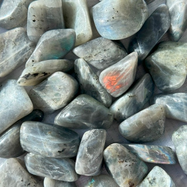 Labradoritt tromlet fra Madagaskar. Disse er ca 1-2cm. Fargene varierer fra lilla, oransje, blå, grønn. Det vil bli tilfeldig plukket ut en til deg. Obs: Naturlige merker/groper forekommer.