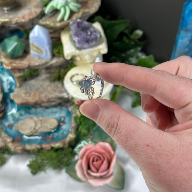 Kjempe søt Labradoritt sølvbelagt ring. Disse ringene passer de fleste da de kan justeres. OBS: De tåler ikke mye bøying at og frem før de knekker. Vær obs på dette før kjøp!