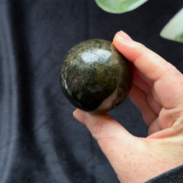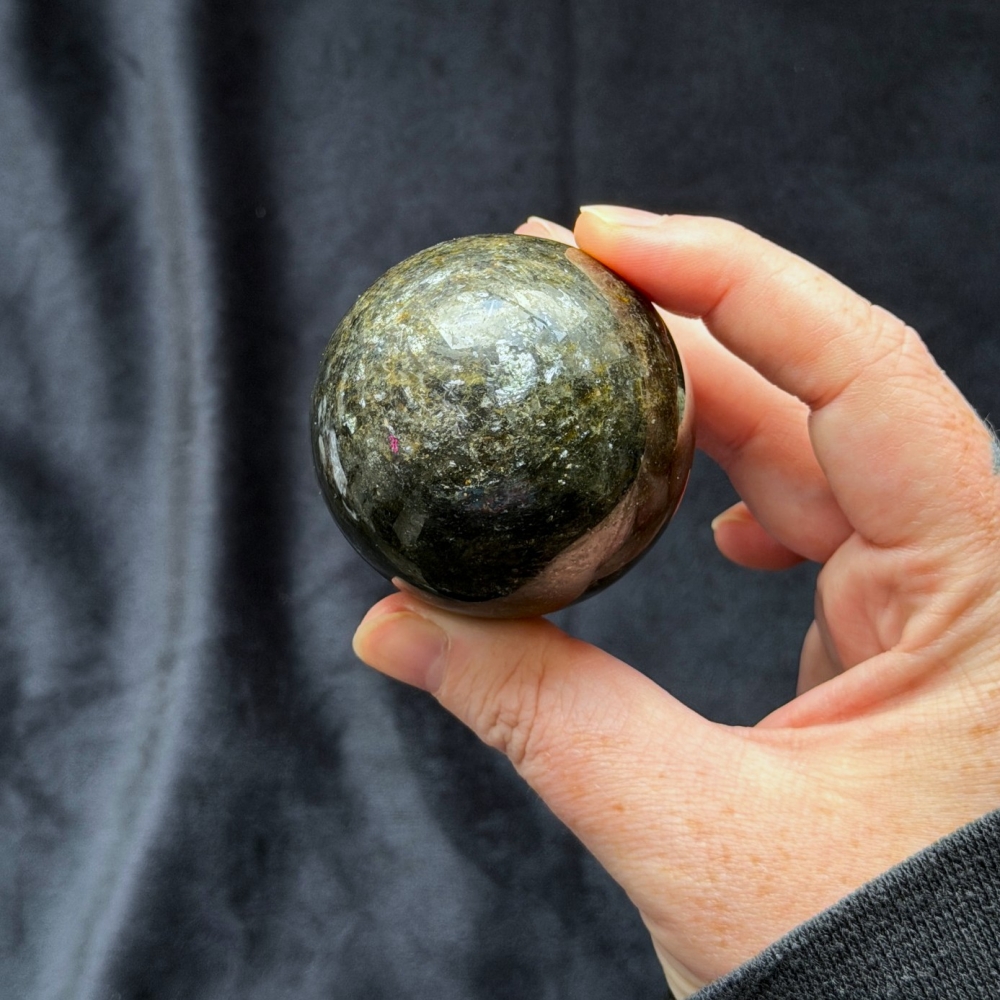 I kuleform fremheves det naturlige spillet i steinen. Den runde formen gjør at lyset fanges fra flere vinkler, og gir kulen et levende og nesten kosmisk uttrykk. Med sin størrelse på 5cm og vekt på 241g er dette en solid og dekorativ kule som passer perfekt i hjemmet, på et alter, i en samling eller som et mørkt, elegant blikkfang.