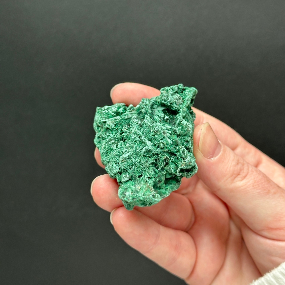 Nydelig grønn fibrøs Malakitt råbit. Denne du ser her veier ca 81 gram og er 6,5cm lang. Det er den du ser på bildene du får hvis du bestiller denne. Bildene er tatt i dagslys.