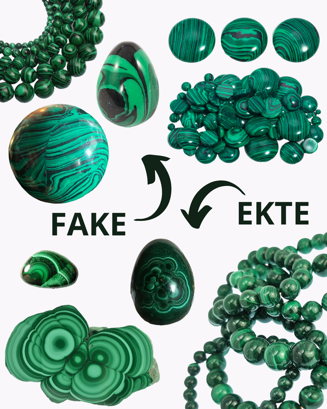 Bildet nedenfor finner du ekte og falsk (menneskelagd) Malakitt. Vi forklarer forskjellen under bildet.