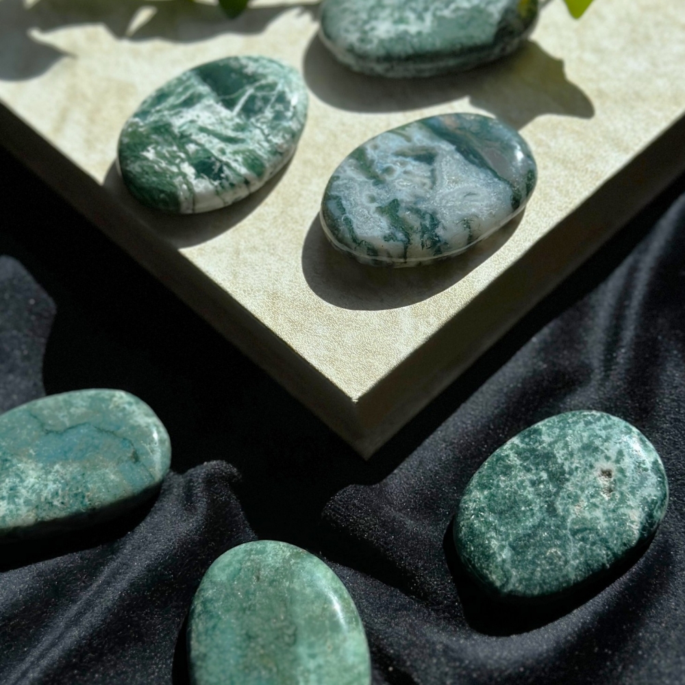 Mose Agat krystallen har alltid blitt sett som en heldig amulett. Når den plasseres blant blomster, ser de ut til å blomstre bedre. Mose Agat er en magisk stein, dens fargetoner bringer deg tilbake til naturen uansett hvor langt unna du er. Med denne steinen i nærheten, puster du dypt inn duften av furu, sollys gjennom skyggefulle trær og den avkjølende lyden av vann som renner over steiner. Det er ikke rart at Mose Agat krystallen kan helbrede hjertet ditt på et øyeblikk, kan hjelpe deg med å holde deg forankret til verden under føttene dine, og kan holde deg renset og klar for de sykliske endringene som kommer din vei.