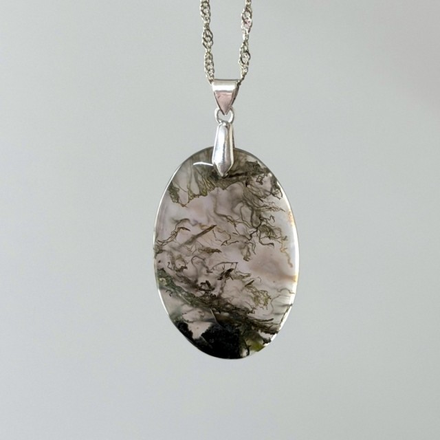 Mose Agat er en variant av Kalsedon (en form for kvarts) med innslag av grønne mineraler som danner mønstre som ligner mose eller skog. Den er teknisk sett ikke en "ekte agat", siden den ofte mangler de klassiske båndene, men navnet har fulgt den i århundrer. Mose Agat finnes mange steder i verden, blant annet i India, Brasil og USA. Den har gjennom historien vært sett på som en lykke og fruktbarhetsstein, spesielt i forbindelse med natur og jordbruk.