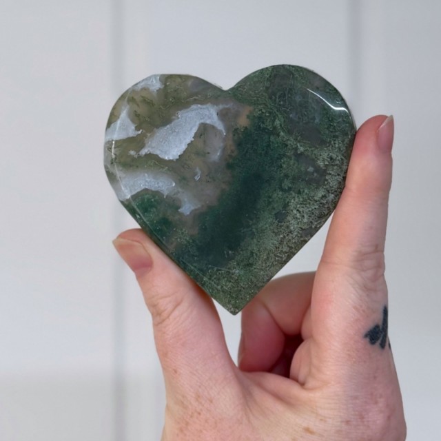Som en levende bit av Moder Jord forbinder Mose Agat deg til naturens rytmer. Den sprer velstand, ro og harmoni - rett og slett som en skogstur i krystallform. Dette hjertet er 7,9x7,6x1,3cm og veier ca 141,6g.