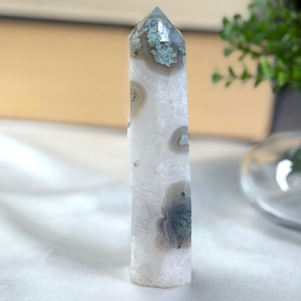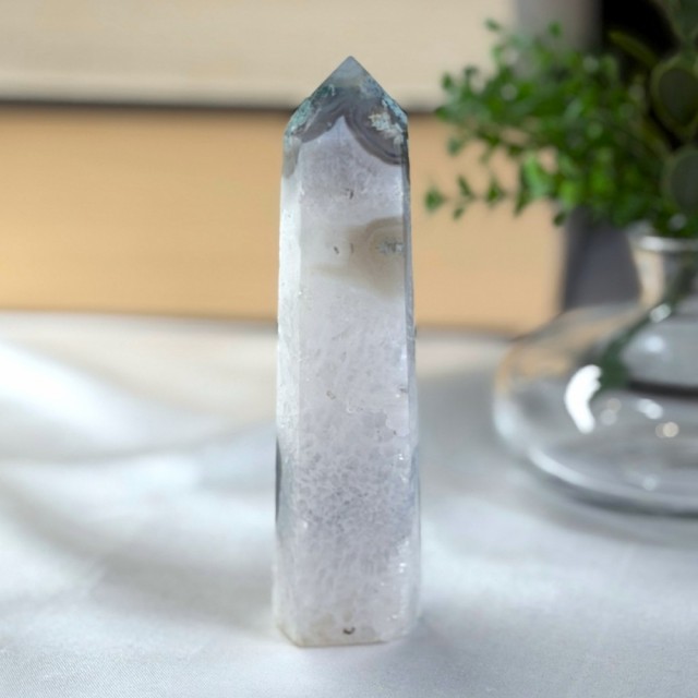 Som en levende bit av Moder Jord forbinder Mose Agat deg til naturens rytmer. Den sprer velstand, ro og harmoni. Rett og slett som en magisk skogstur i krystallform. Dette tårnet er 11,2cm og veier ca 144,7g. Står bittelitt skeivt.