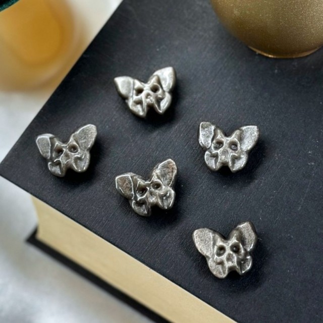 Mystisk Death’s Head Moth utskåret i Silver Sheen Obsidian. Den skimrende sølvglansen gir en mørk og magisk aura - perfekt som alterpynt, amulett eller spooky samlerobjekt. Disse er mini størrelse, ca. 2cm.