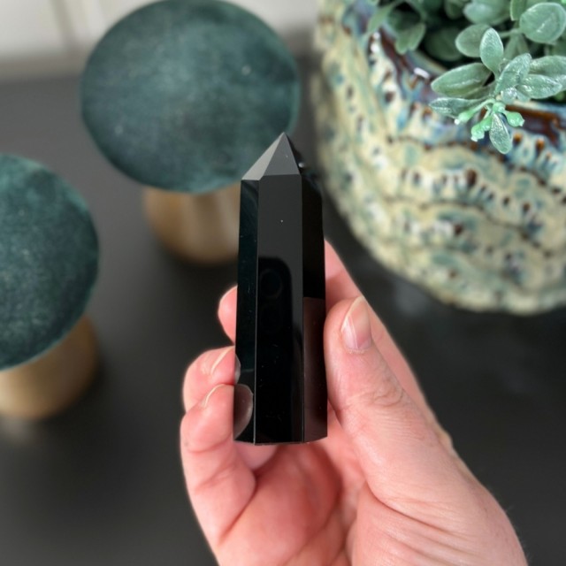 Svart Obsidian (vulkansk glass) tårn fra 8-8,5cm høyde. Det vil bli tilfeldig plukket ut til deg om du bestiller disse.