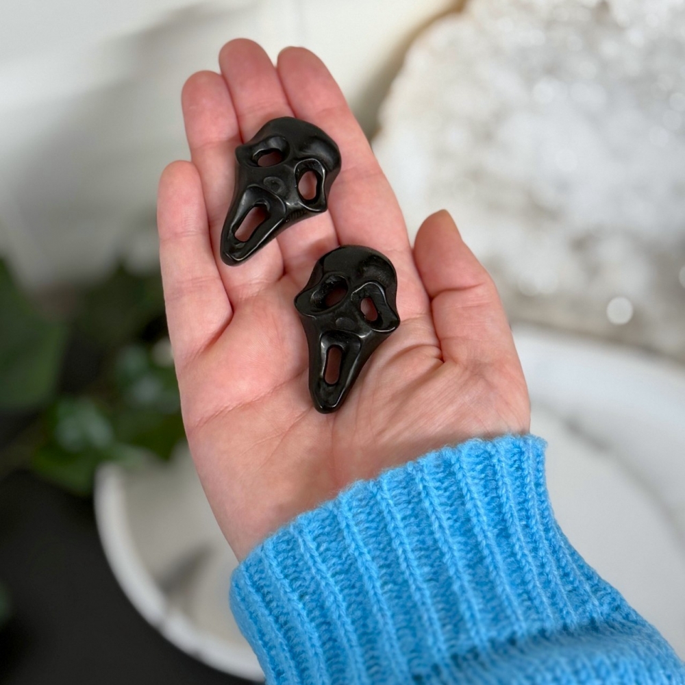 Svart Obsidian Ghost Face ca 5cm. En mørk og mystisk carving med kraftfull tilstedeværelse. Perfekt for deg som elsker det dramatiske, det beskyttende og det litt edgy.