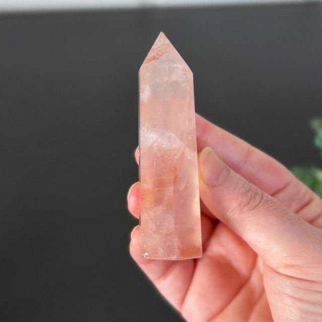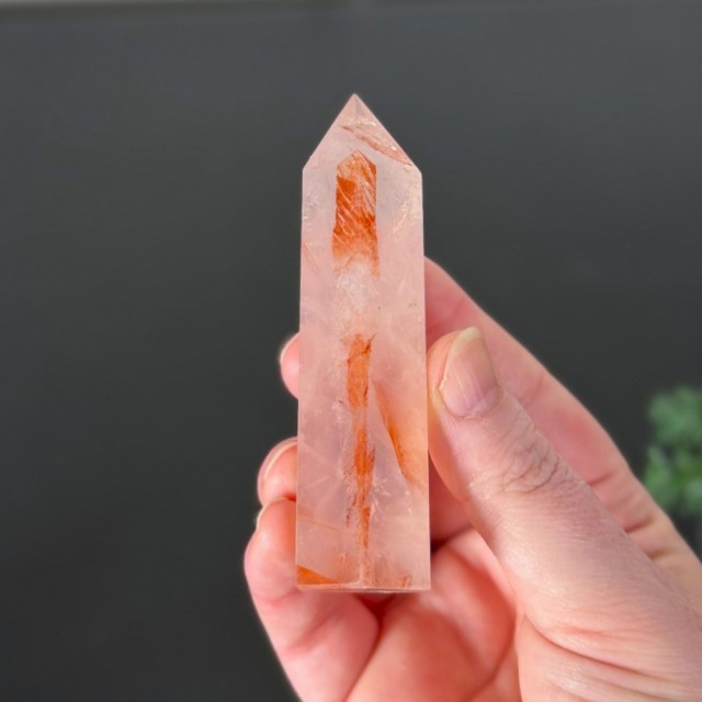 Et kraftfullt og levende hjerte fylt med ildens energi. Dette Flammekvarts tårnet gløder med naturlige flammer av rød og gyllen varme som gir deg en gnist av styrke, lidenskap og indre driv. Dette tårnet er ca 9cm og veier 95,2g.