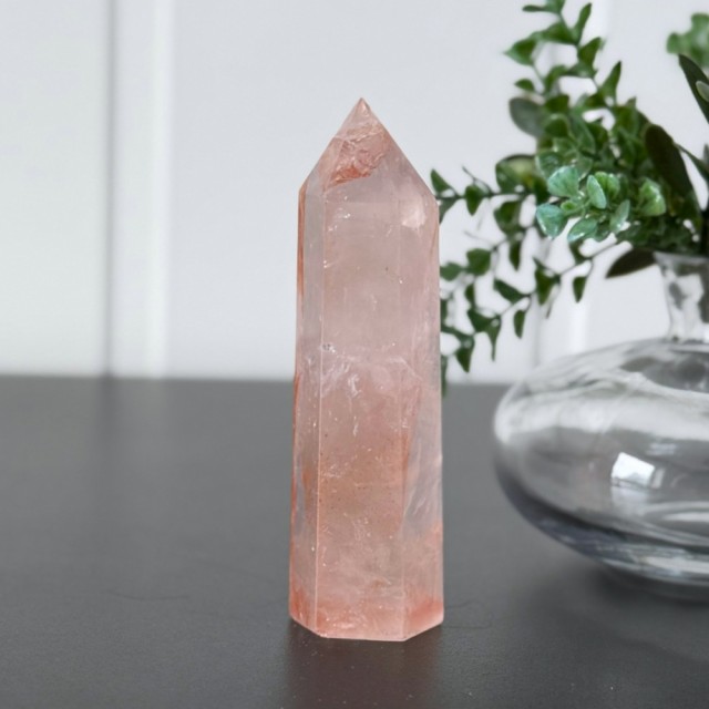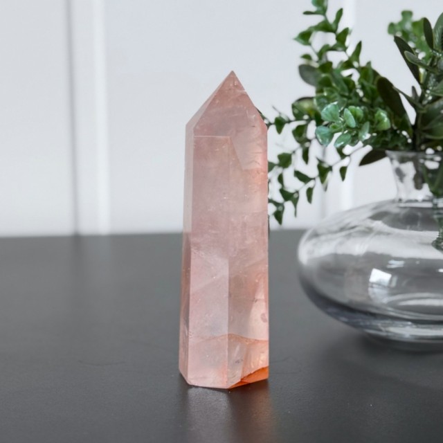 Flammekvarts, også kjent som Hematitt Kvarts eller Fire Quartz, er en kombinasjon av klar kvarts og jernoksid. Det er nettopp jernet som skaper de flammende innslagene i rødt, oransje og rosa nyanser, og gir krystallen sitt levende uttrykk.