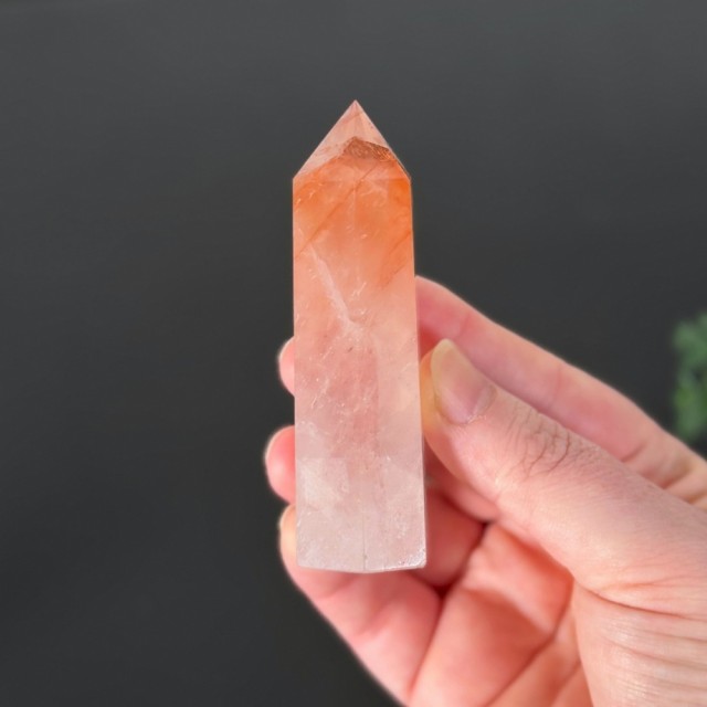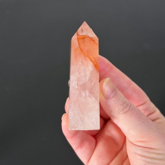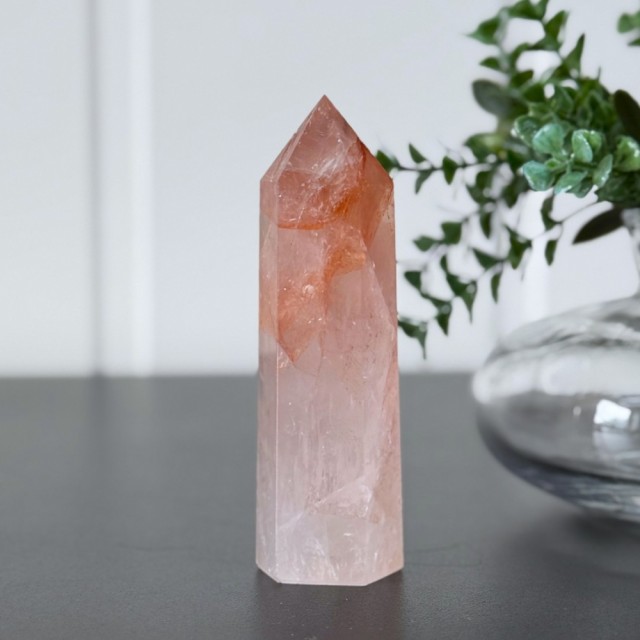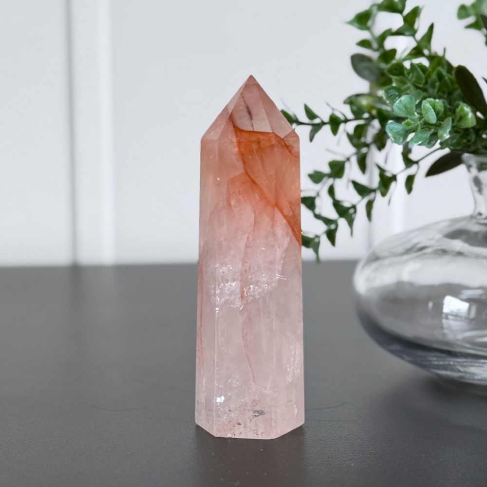 Flammekvarts, også kjent som Hematitt Kvarts eller Fire Quartz, er en kombinasjon av klar kvarts og jernoksid. Det er nettopp jernet som skaper de flammende innslagene i rødt, oransje og rosa nyanser, og gir krystallen sitt levende uttrykk.