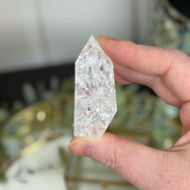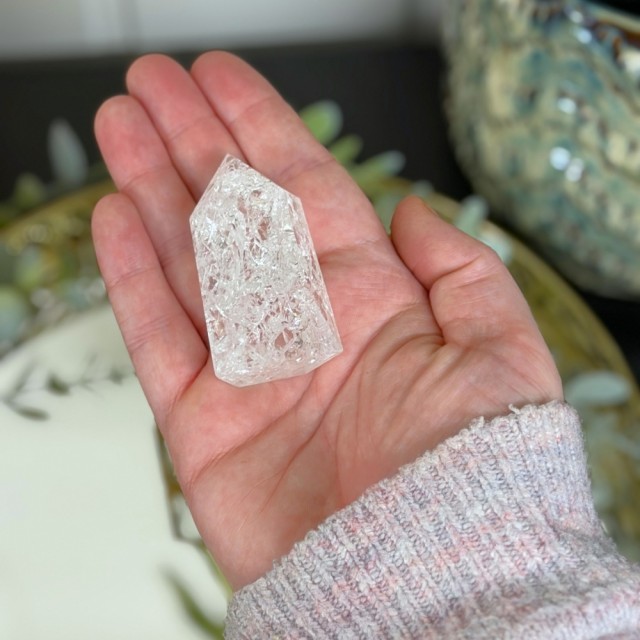 Crackle Quartz er kjent for å forsterke meditasjon, intuitiv innsikt og høyfrekvent energiarbeid. Den åpner ofte opp for spirituelle gjennombrudd og dypere forbindelse til universell visdom, og passer godt til intensjonsarbeid, healing og å manifestere forandring. Mange opplever at den hjelper med å skape ny energi etter perioder med følelsesmessig opprydding.