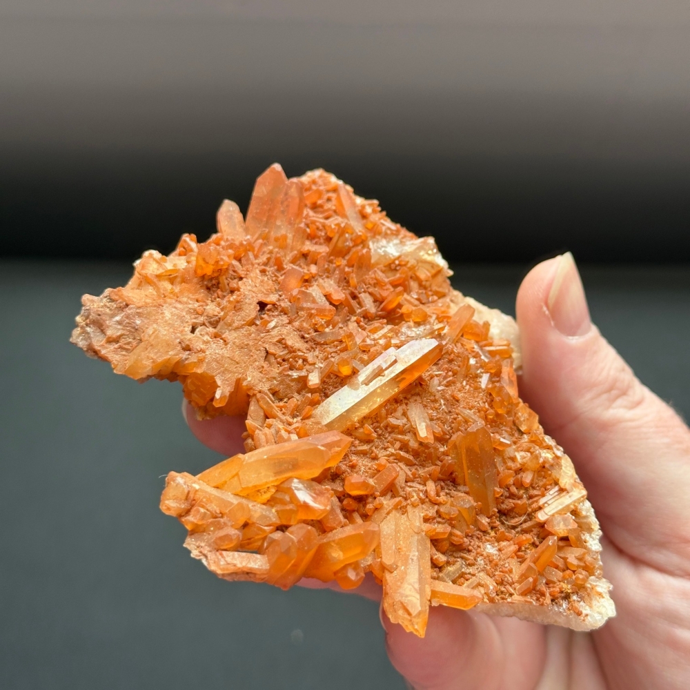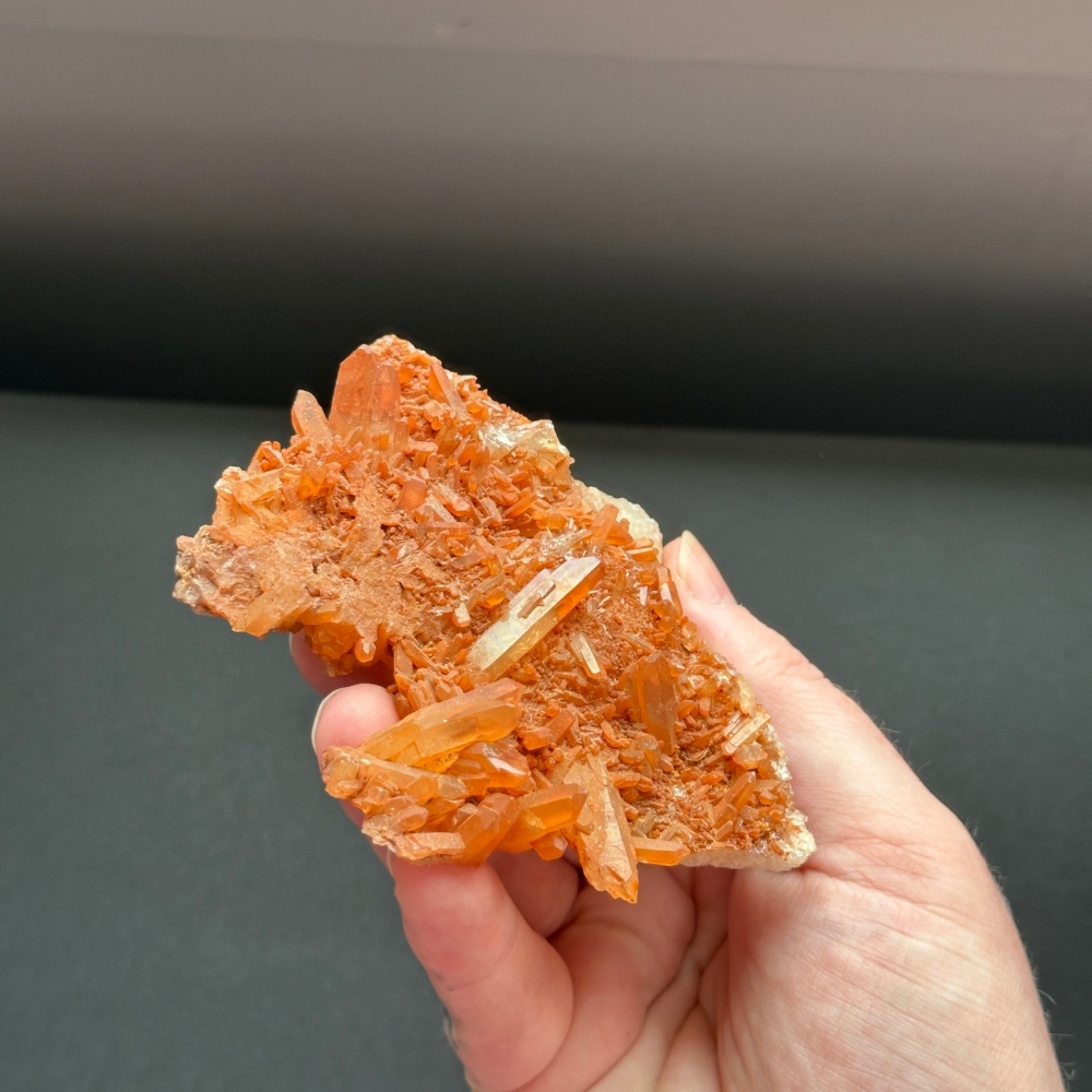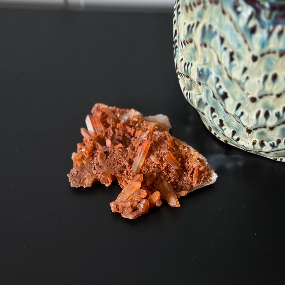 Nydelig flat Mandarinkvarts (Tangerinekvarts) gruppe. Denne veier ca 102g og er ca 9,8x8,2x1,6cm. Det er den krystallen på bildene du får hvis du bestiller denne. OBS: Små biter kan falle av i frakt.