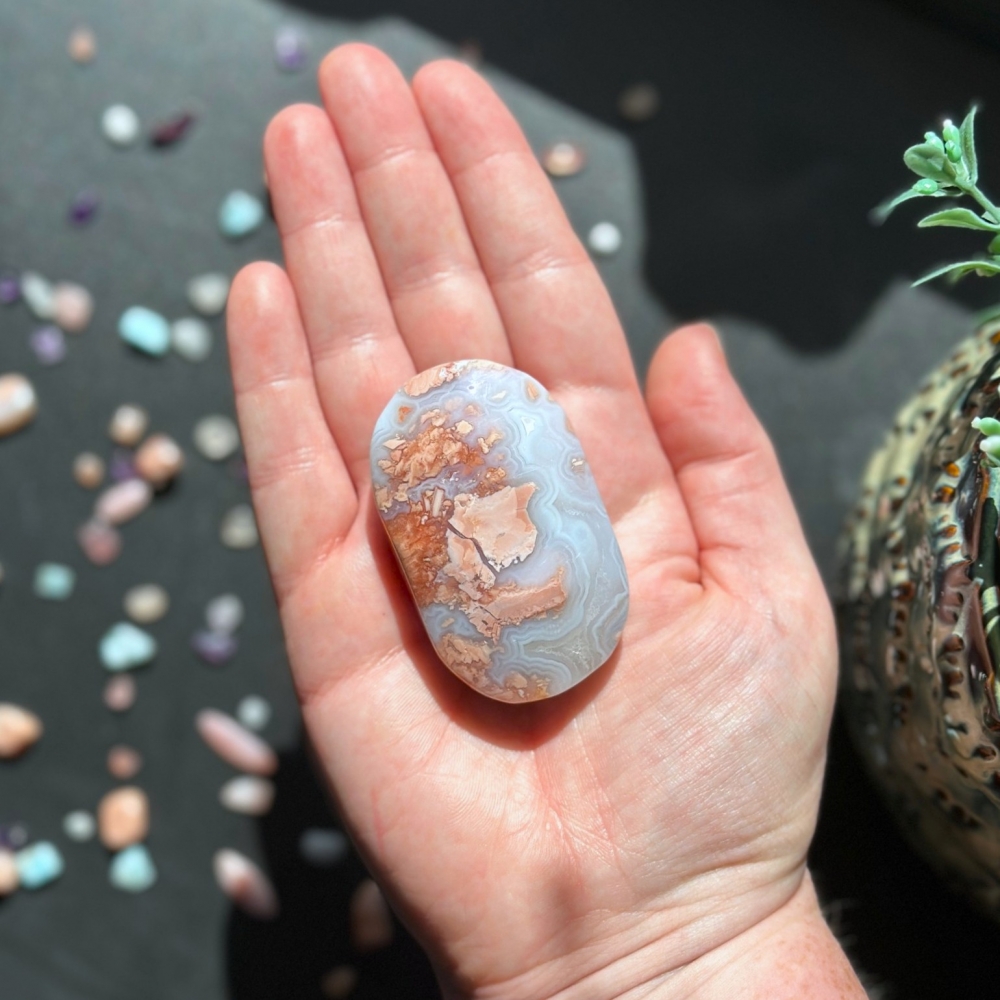 Rosa Agat (sukkerspinn agat) håndstein. Denne er 6,4x3,8x1,8cm og veier ca 69g. Det er den krystallen du ser på bildene du får hvis du bestiller denne skatten. Naturlige små merker forekommer.