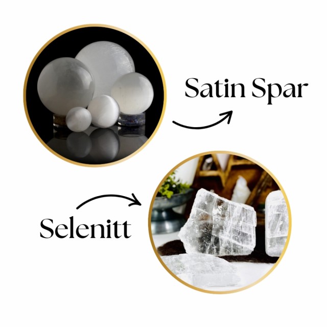 Disse er begge av samme mineral Gips/Gypsum. Men, det som skiller disse to navnene er at Selenitt er en gjennomsiktig og fargeløs (eller veldig lett farget) variant av Gypsum. Mens Satin Spar er en fibrøs form for Gypsum. Den er generelt hvit, silkeaktig og gjennomsiktig med perleaktig eller melkeaktig utseende. Du kan også finne Fersken/Oransje farget av disse.