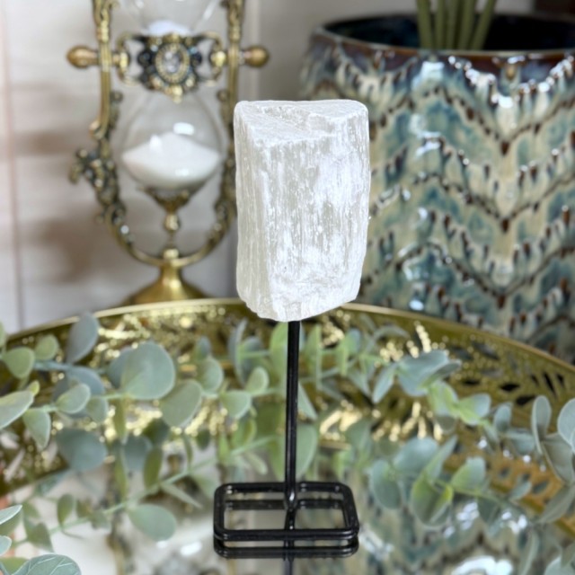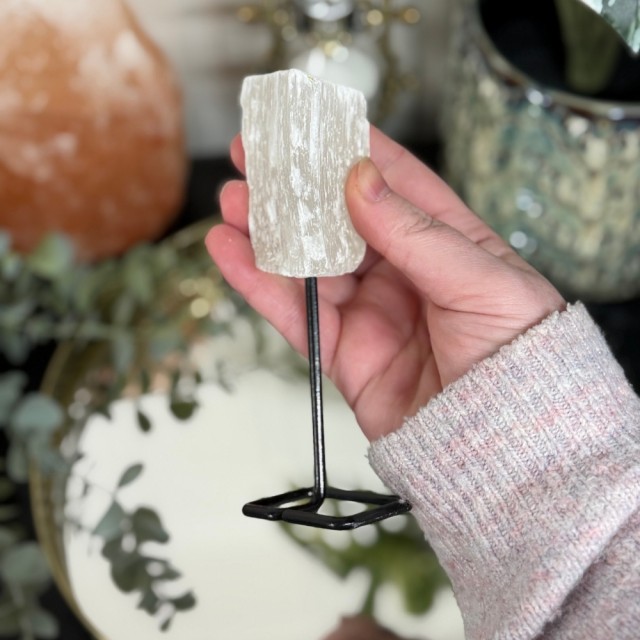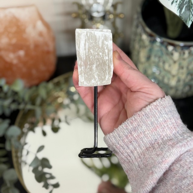 Selenitt er en utrolig skjør krystall og kommer som regel med små merker på seg fra frakt. Den er faktisk så delikat at så mye at selv en negl kan få steinen til å få riper. Denne er ca 14cm høy.