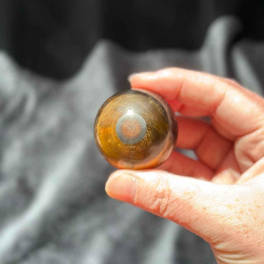 En nydelig liten gullskinnende Tigerøye kule på 4,1cm og ca. 98g - et glødende symbol på styrke, mot og selvsikkerhet. Med sitt hypnotiske skinn beskytter den mot negativitet, balanserer energi og bringer et snev av ren solmagi inn i ditt hjem.