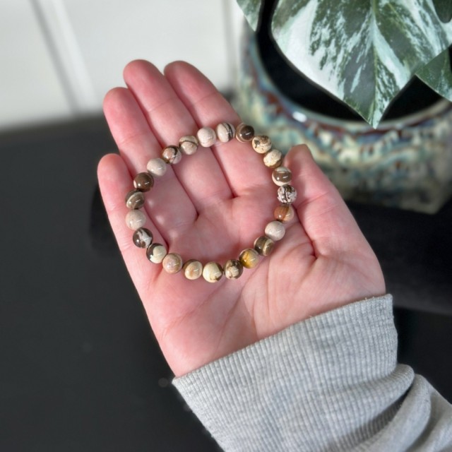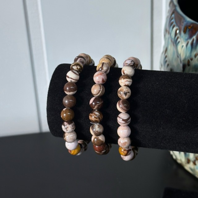 Brun Zebra Jaspis er en krystall av stabilitet og styrke. Den forankrer deg til jorden, balanserer kropp og sinn, og gir energi til å møte livets utfordringer med ro. Disse er 8mm og passer ca 16-17 håndledd.