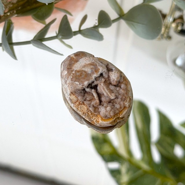 Geologisk sett er dette en kombinasjon av fossilt materiale og sekundær mineralisering, ofte med kvarts eller kalsedon som krystalliserer inne i strukturen. Det betyr at du bokstavelig talt holder både historie og krystall i hånden.